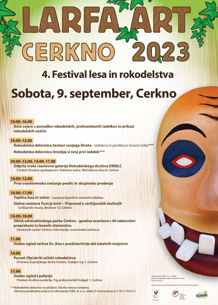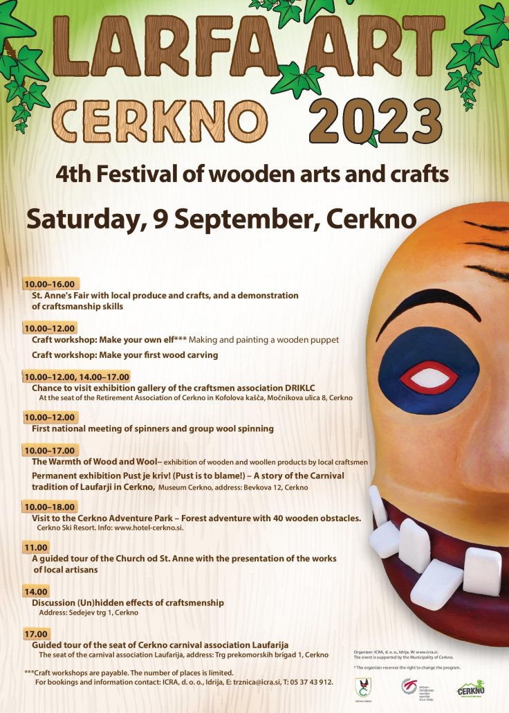 V Cerknem bo v soboto, 9. septembra potekal četrti Festival lesa in rokodelstva LARFA ART CERKNO 2023, ki bo ponudil zanimive aktivnosti za rokodelce in za vse tiste, ki ste željni novih znanj na področju rokodelskih veščin in spretnosti, ljubitelje lepega, lesenega in lokalnega. Na središču Cerknega bo potekalo prvo vseslovensko srečanje predic in skupinsko predenje. Anin sejem bo bogat s ponudbo rokodelskih in prehrambenih izdelkov. Na ogled bo razstava Toplina lesa in volne – razstava lesenih in volnenih izdelkov v Cerkljanskem muzeju. Letos smo lesu dodali nov naravni material – volno. Na razstavi svoje izdelke razstavljajo lokalni podjetniki lesarji in rokodelke, članice rokodelske sekcije Društva rejcev drobnice Idrija-Cerkno.