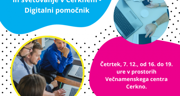 V četrtek, 7. 12., bo v Cerknem zopet na voljo točka za digitalno podporo in svetovanje. Tudi tokrat bo na razpolago strokovnjak za vprašanja na temo uporabe računalnika in drugih digitalnih tehnologij, računalniških programov, pametnih telefonov, spletnih aplikacij in vseh drugih zagat v povezavi z digitalnim svetom.