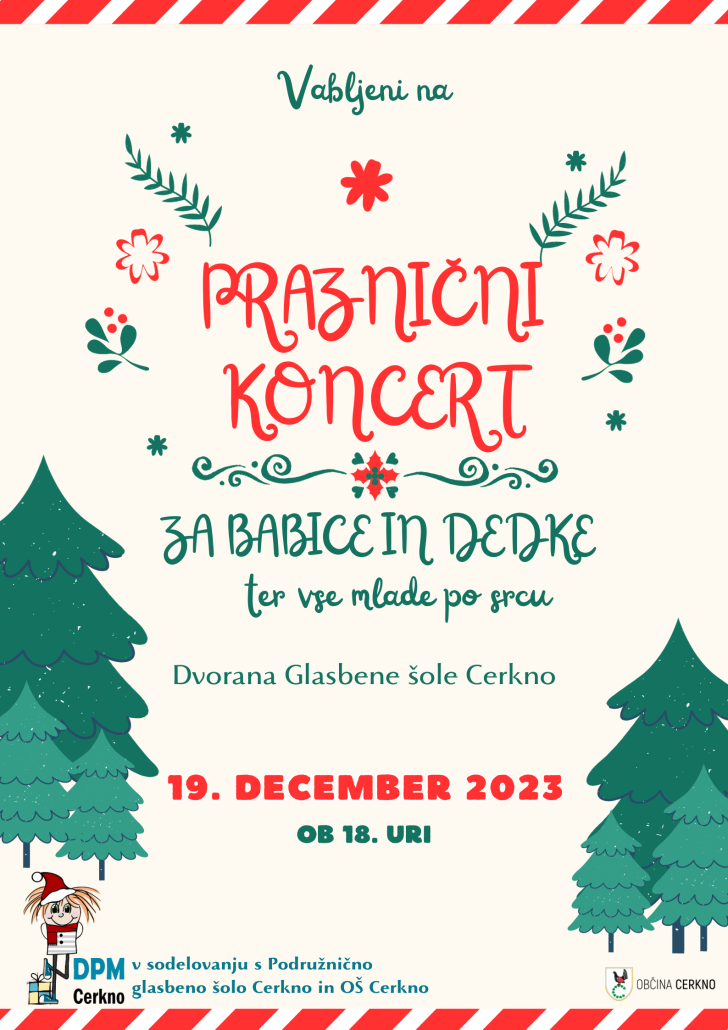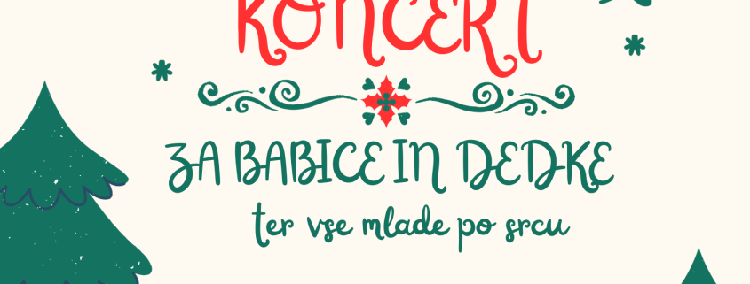Vabljeni na praznični koncert za babice in dedke ter vse mlade po srcu. Koncert bo potekal v torek, 19. decembra, ob 18. uri, v dvorani Glasbene šole Cerkno.