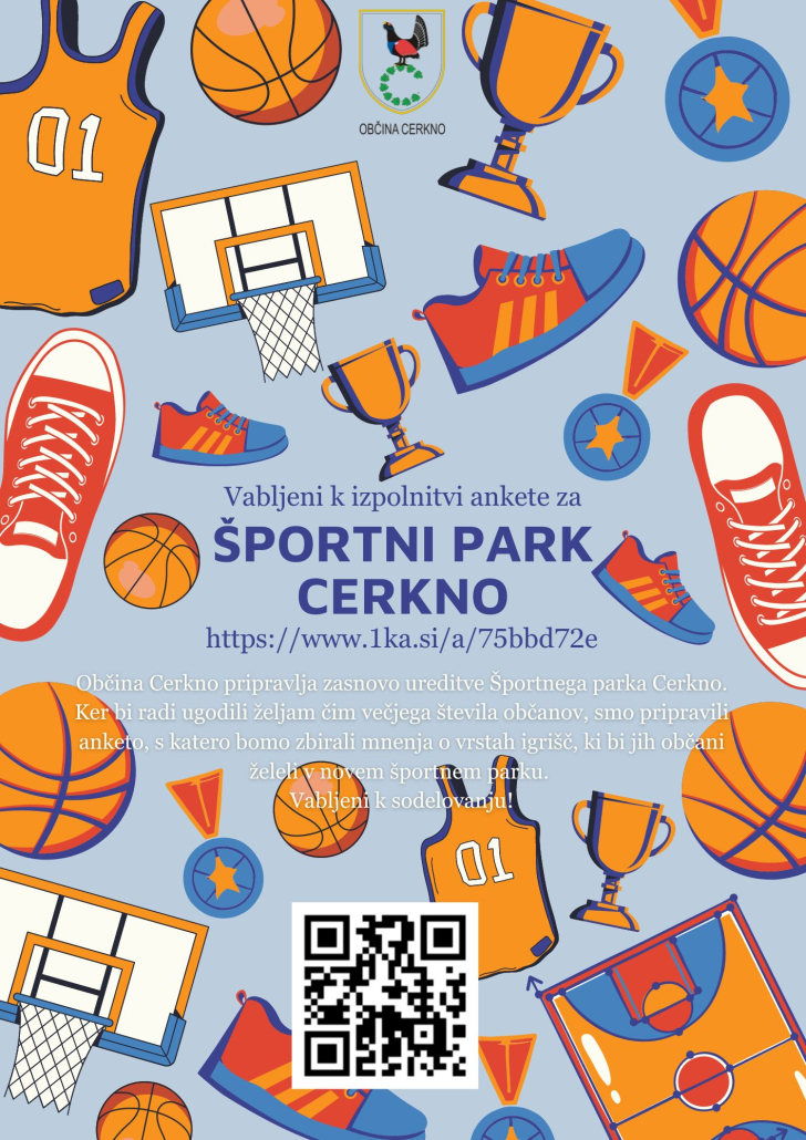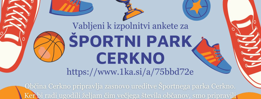 Občina Cerkno pripravlja zasnovo ureditve Športnega parka Cerkno. Ker bi radi ugodili željam čim večjega števila občanov, smo pripravili anketo, s katero bomo zbirali mnenja o vrstah igrišč, ki bi jih občani želeli v novem športnem parku.