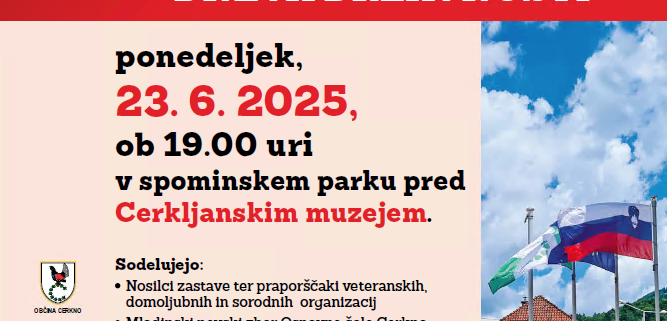 Vljudno vabljeni v ponedeljek, 23. junija 2025 ob 19. uri v spominski park pred Cerkljanskim muzejem, kjer bomo v počastitev dneva državnosti imeli svečanost z dvigom slovenske zastave.