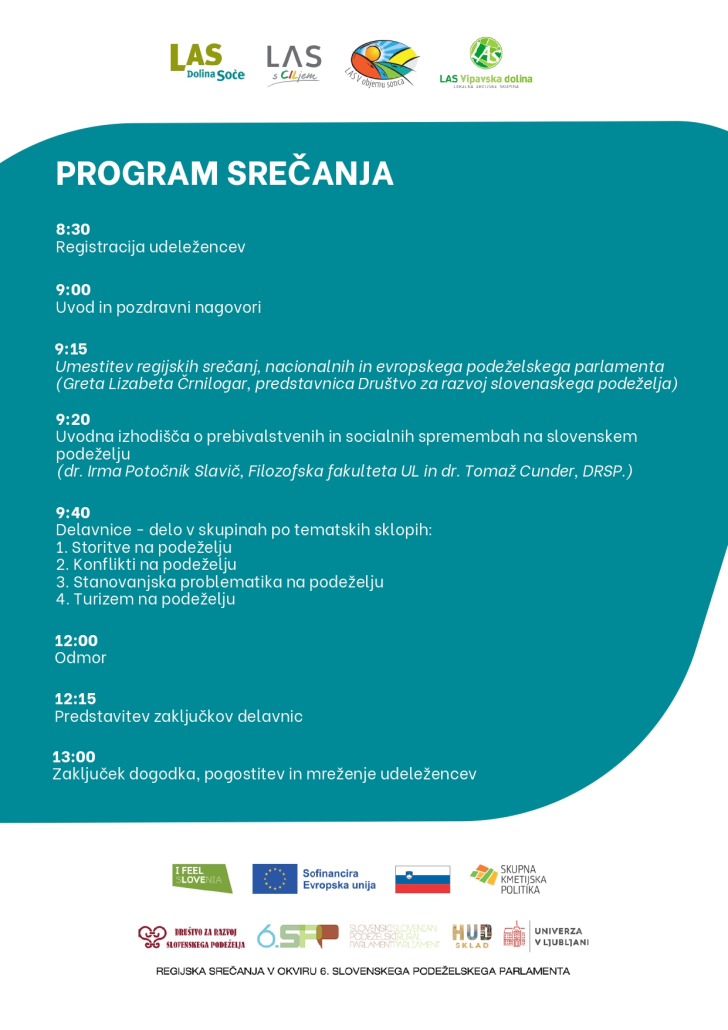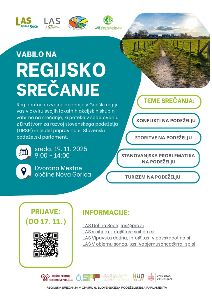 Štiri lokalne akcijske skupine (LAS) na Goriškem: LAS Dolina Soče, LAS s CILjem, LAS Vipavska dolina in LAS V objemu sonca, vas vabimo na regijsko srečanje Goriške regije, ki bo potekalo v sredo, 19. 11. 2025, od 9. ure dalje, v Dvorani Mestne občine Nova Gorica (Trg Edvarda Kardelja 1, 5000 Nova Gorica).