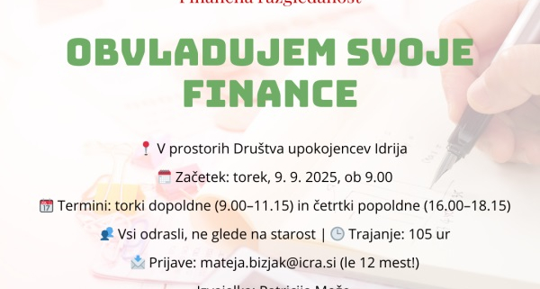 Brezplačni program Obvladujem svoje finance bomo na ICRA začeli izvajati septembra 2025 v okviru projekta Finančna razgledanost. Program bomo v Idriji izvedli samo tokrat, zato ne zamudite priložnosti, da pridobite ključna finančna znanja, ki vam bodo pomagala pri boljšem načrtovanju osebnih financ in doseganju finančne varnosti.