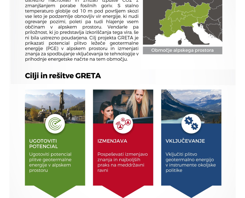 Vabljeni k prebiranju aktualnih novic projekta GRETA – Plitvi geotermalni viri na območju alpskega prostora (Near-surface Geothermal Resources in the Territory of the Alpine Space), katerega namen je izboljšati energetsko učinkovitost in trajnostno proizvodnjo obnovljive geotermalne energije v prostoru.