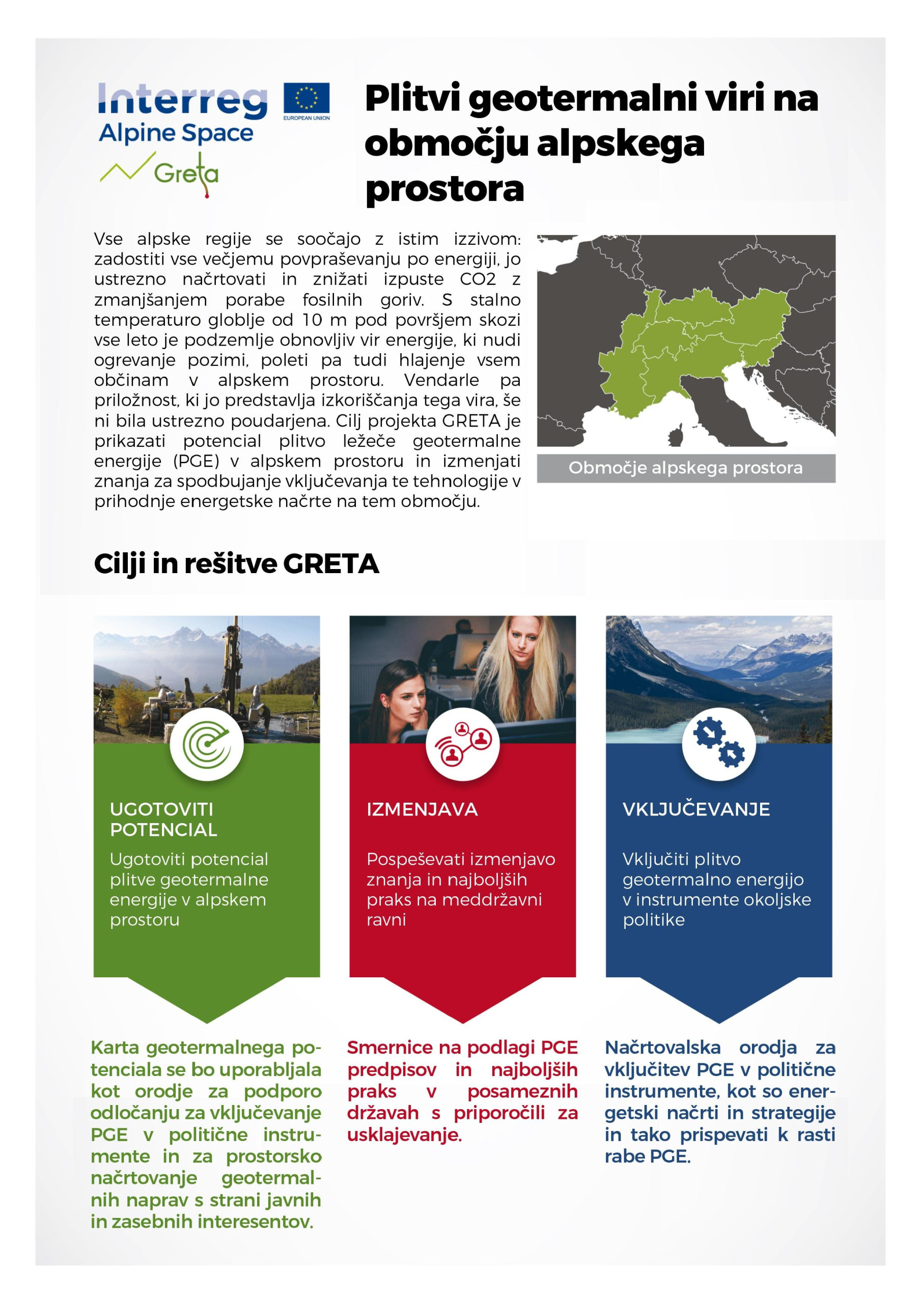 Začel se je projekt GRETA (Near-surface Geothermal Resources in the Territory of the Alpine Space), v prevodu Plitvi geotermalni viri na območju alpskega prostora. Namen projekta je izboljšati energetsko učinkovitost in trajnostno proizvodnjo obnovljive geotermalne energije v alpskem prostoru.