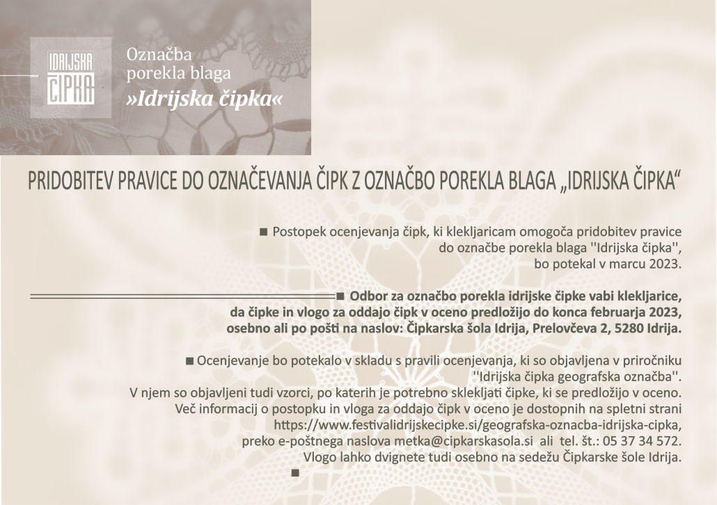 Odbor za označbo porekla idrijske čipke vabi klekljarice, da čipke in vlogo za oddajo čipk v oceno predložijo do konca februarja 2022, osebno ali po pošti na naslov: Čipkarska šola Idrija, Prelovčeva 2, 5280 Idrija.