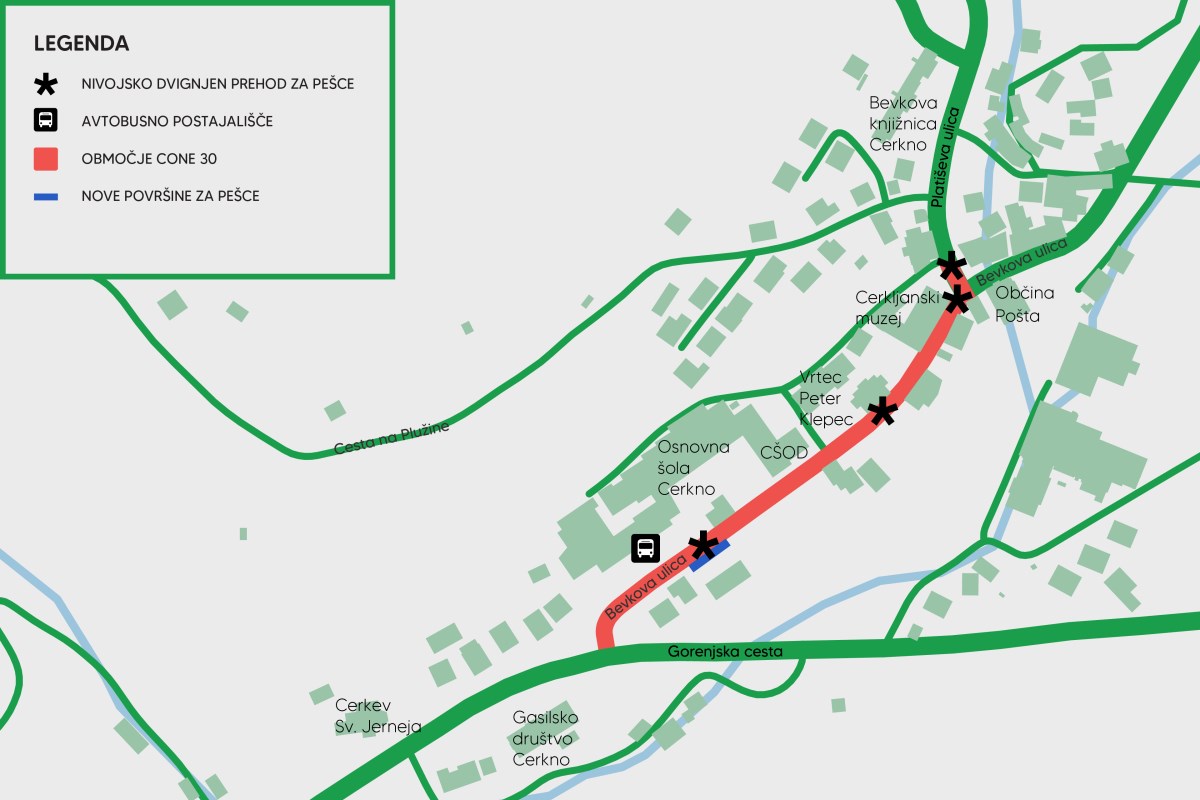 Nov prometni režim bo prinesel nov pločnik, štiri osvetljene in na ploščadi dvignjene prehode za pešce, Cono 30 km/h pri šoli, vrtcu, glasbeni šoli in CŠOD ter barvite oznake namesto sredinske črte na cestišču.