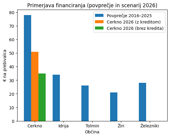 Tudi v daljšem obdobju se Občina Cerkno uvršča nad primerljive občine, saj je v letih 2016–2025 namenila približno 78 EUR na prebivalca letno, medtem ko Idrija 34 EUR, Tolmin 26 EUR, Železniki 28 EUR in Žiri 21 EUR.