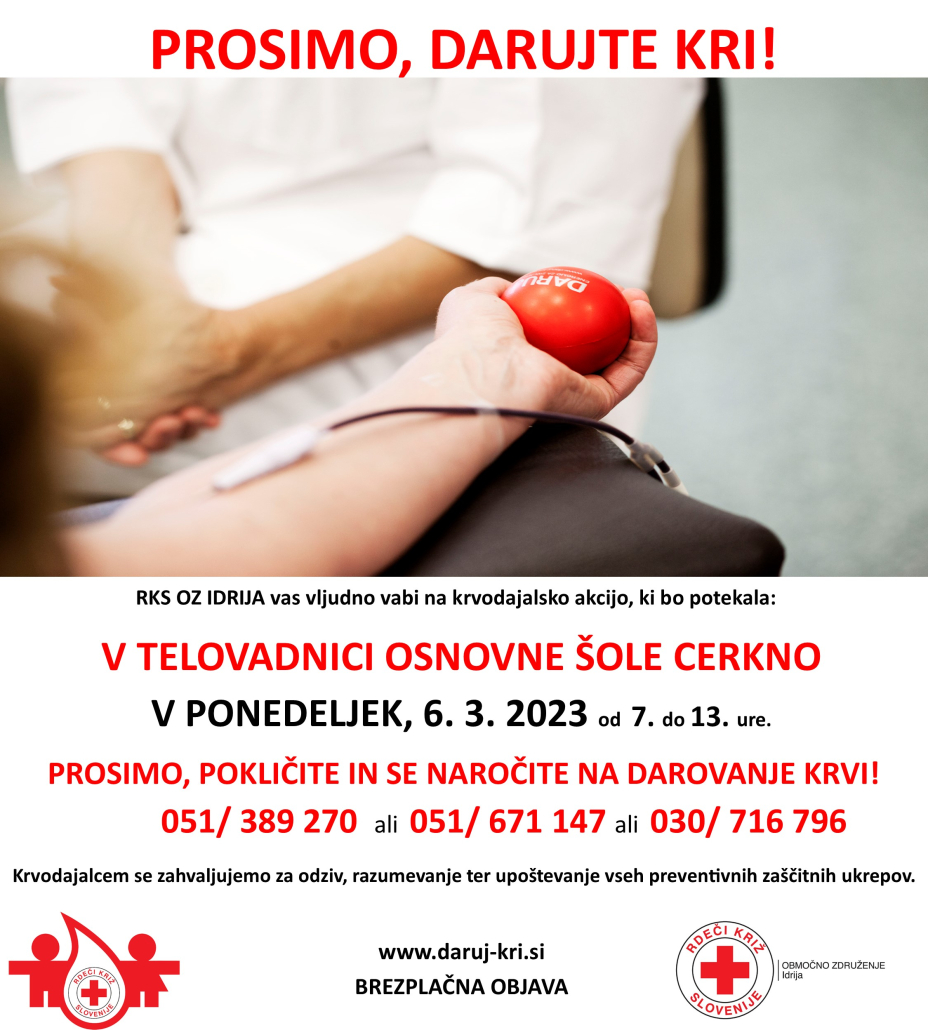 Rdeči križ Slovenije – Območno združenje Idrija vas vljudno vabi na krvodajalsko akcijo, ki bo potekala v telovadnici OŠ Cerkno v ponedeljek, 6. marca, od 7. do 13. ure.