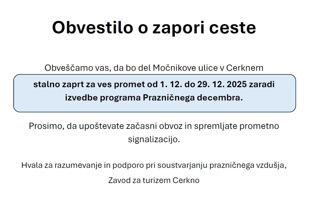 Obveščamo vas, da bo od 1. decembra do vključno 29. decembra v Cerknem zaprt del Močnikove ulice – in sicer od Glavnega trga do Trga prekomorskih brigad.